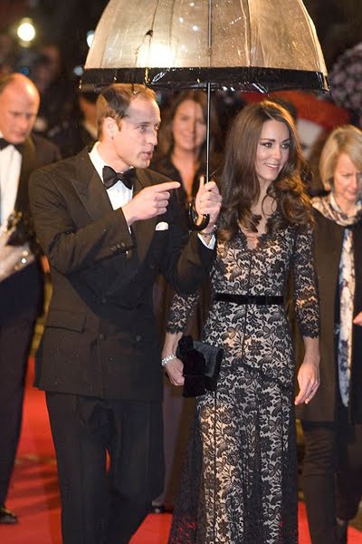 Кейт е в дълга рокля от черно кадифе Alexander McQueen (дизайнер Сара Бъртън) и ослепително диамантено колие.